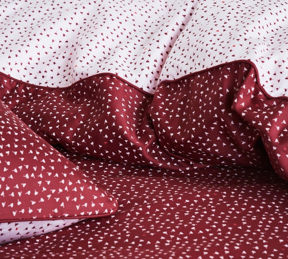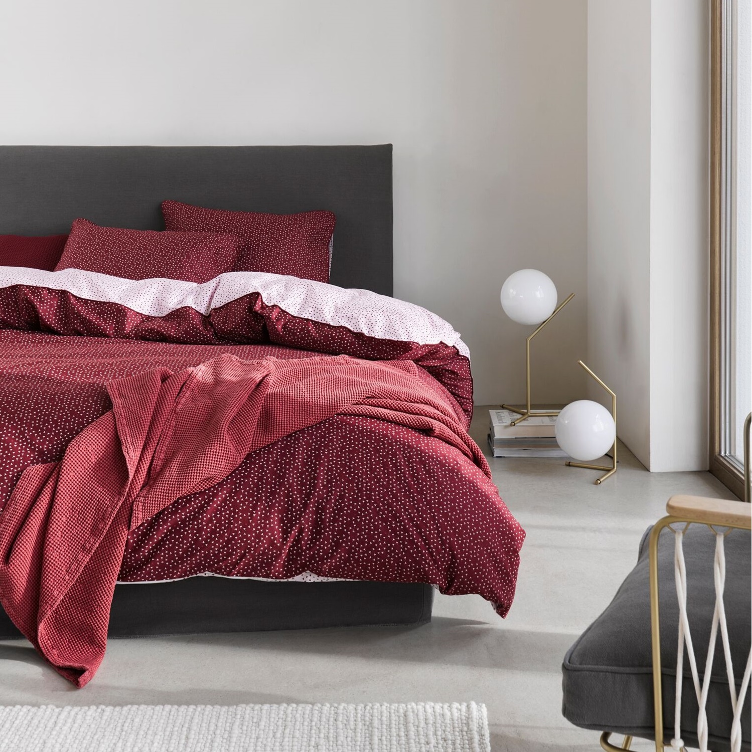 Auf der wunderschönen roten Bettwäsche Svara von Marc O’Polo regnet es Blumen. Oder besser gesagt: Weht es Blumen, denn die weißen Blumen wurden in alle Richtungen verteilt - herrlich verspielt! Ab und zu wird man von einer Blüte in hellerem Rot überrascht. Auch auf der weißen Rückseite wurden unzählige Blumen verstreut. Blumen in Hülle und Fülle!