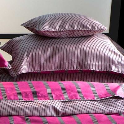 Movie ist Satin Bettwäsche mit breiten fuchsia-farbenen Streifen und dazwischen schmalen schwarzen und weissen Linien als Reminiszenz an 8mm Film.